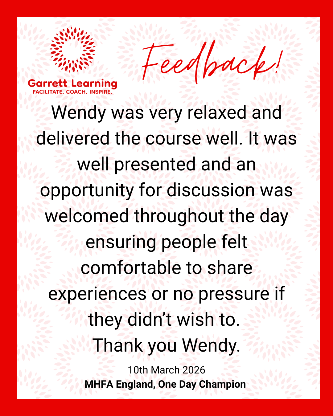 Garrett Learning can support you and your organisation. Please reach out to discuss holistic wellbeing services, people management training and Mental Health First Aid training. We also provide community and support by joining us monthly for the Workplace Wellbeing Champion session or offering bespoke training. Please book in a call to discuss your thoughts and ideas: https://scheduler.zoom.us/garrettlearning/1-1-cuppa-and-chat. Alternatively, you can email us at wendy@garrettlearning.co.uk