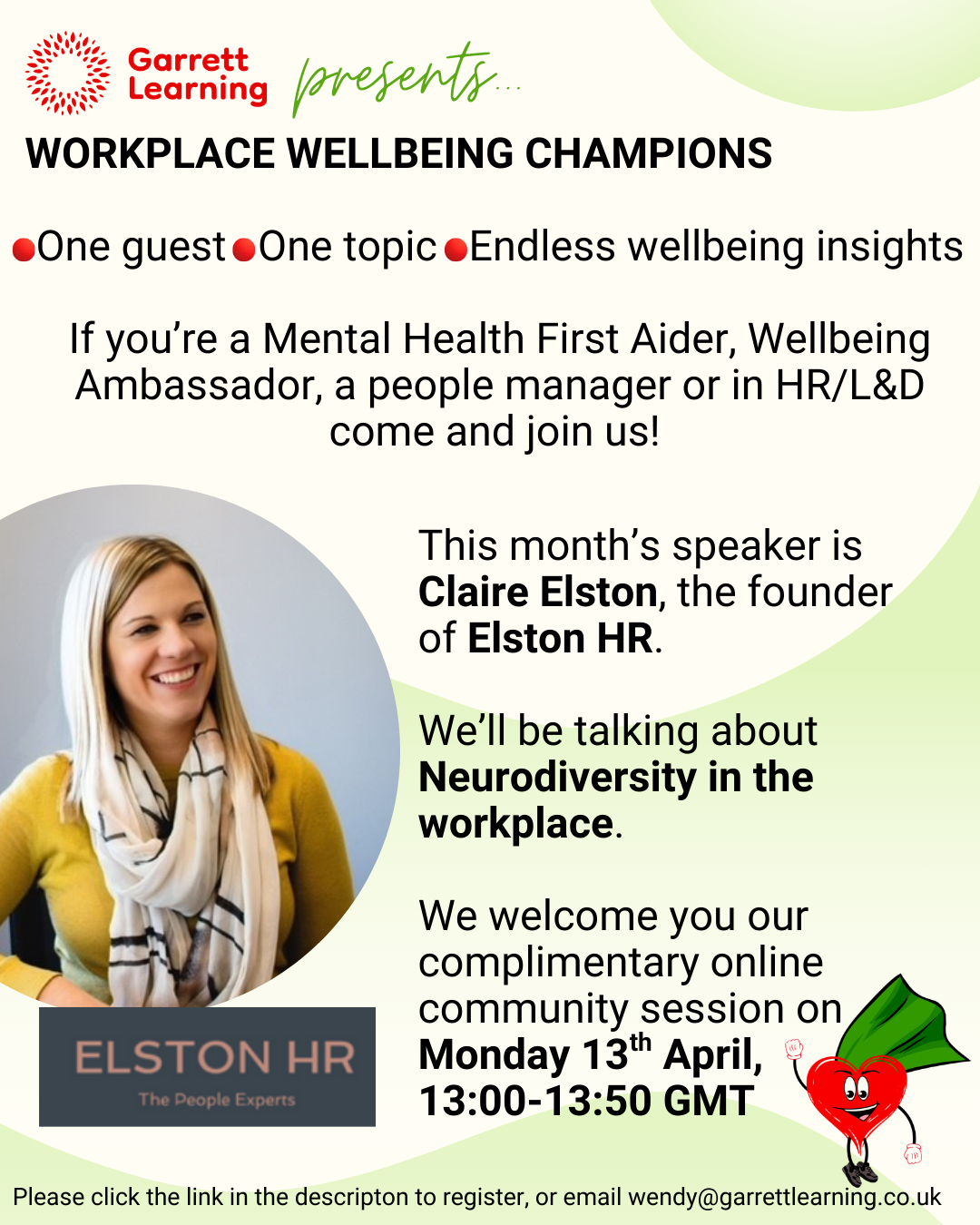 This week is Neurodiversity Celebration Week. It seems apt to share that our next Garrett Learning complimentary monthly support online check-in is all about Neurodiversity in the Workplace. We are joined by guest speakerClaire Elston (Chartered MCIPD), the founder ofElston HR Ltd.