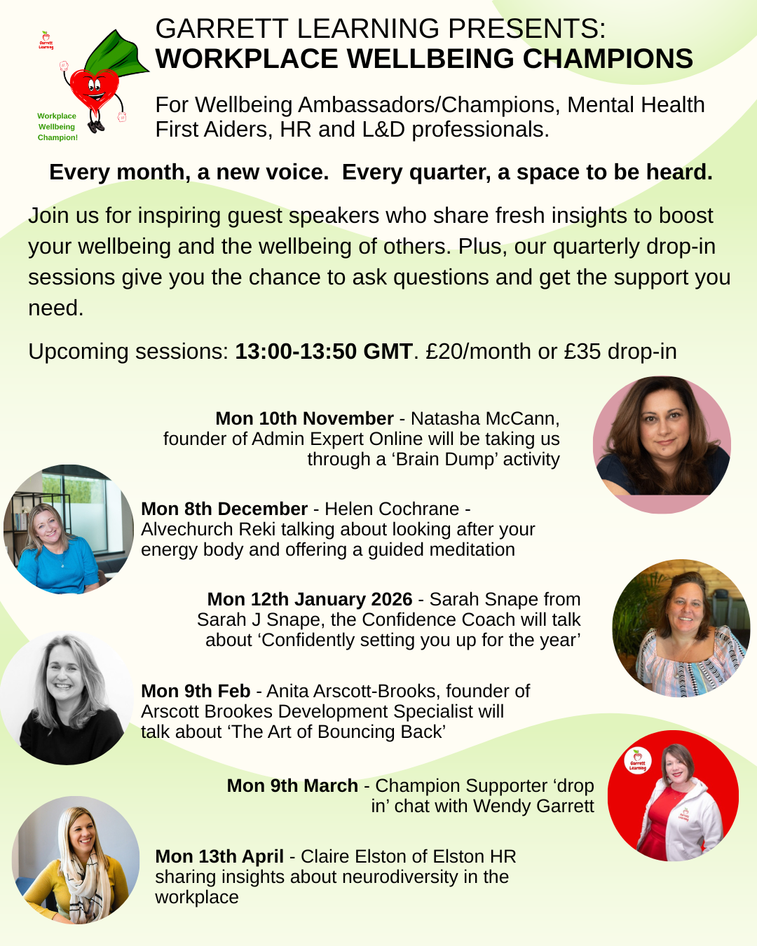 We’re pleased to announce that we have dates, speakers and monthly themes ready to go for the #WorkplaceWellbeingChampions